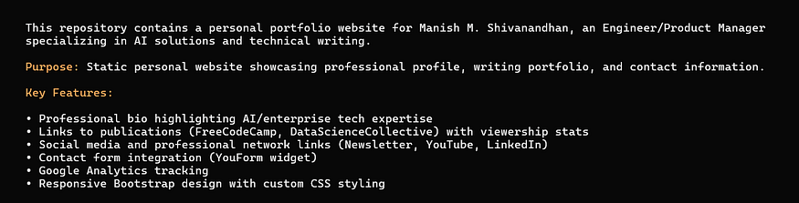 You can then start asking questions like “What does this repository do?”. Here is a sample output from my portfolio website.